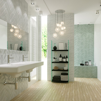 Иногда керамическую плитку укладывают "елочкой", как паркет. Оформленный таким образом пол смотрится весьма необычно и интересно. Такой способ укладки предполагает использование прямоугольной плитки. Его можно применять в двух вариациях: сделать обычную "елочку" или же с прикрепом, то есть использованием маленьких мозаичных плиток другого цвета.